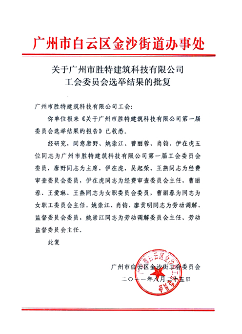 在白云区总工会、金沙洲街道党工委、街道办事处的正确领导下,广州市胜特建筑科技有限公司工会委员会(以下简称胜特工会)于2011年8月25日正式成立。胜特工会作为党委领导下的群众组织,维护职工队伍的团结,帮助困难职工解决生活问题,建立和谐稳定的劳动关系,是促进企业加快改革发展的需要,是推进构建和谐企业的需要,是维护广大职工群众根本利益的需要。