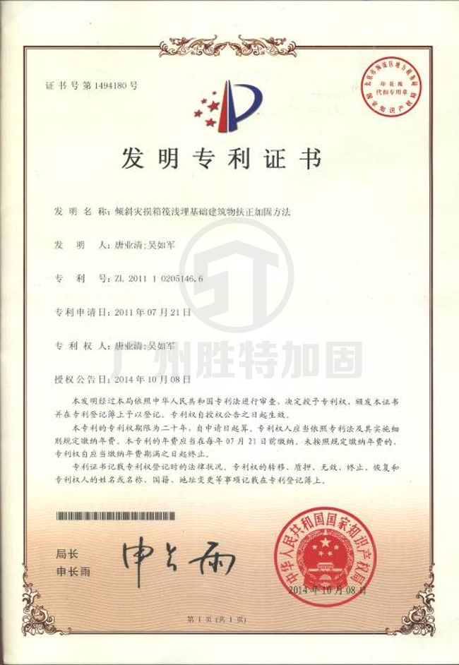 倾斜灾损箱筏浅埋基础建筑物扶正加固方法-新利软件(集团)股份有限公司加固专利技术、专利证书展示,科技成果展示.我司专注于等建筑纠倾,扶正加固工程设计及施工,多年来申请了多种特种工程技术专利.公司加固技术实力雄厚,获国家高新技术企业认证!欢迎广大客户来电咨询或到我司考察.