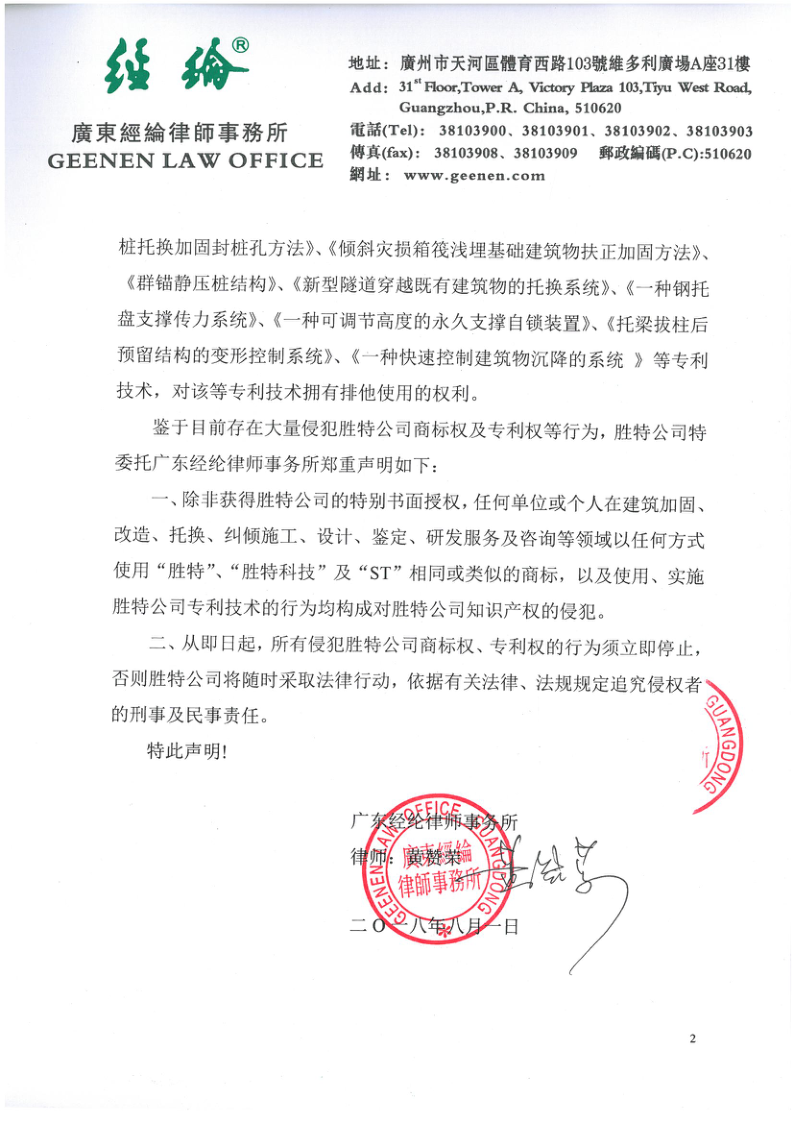 胜特人20年的辛苦耕耘的劳动成果神圣不可侵犯,从即日起,所有侵犯胜特公司商标权、专利权的行为须立即停止,否则胜特公司将随时采取法律行动,依据有关法律、法规规定追究侵权者的刑事及民事责任。